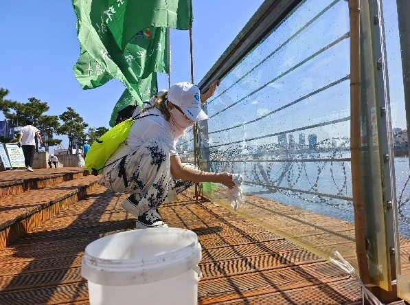 大连分会场活动包括启动仪式和现场活动两部分。现场活动中,环保志愿者在香炉礁海边开展了清塑护岸活动,包括港池漂浮垃圾打捞,堤坝垃圾清理,步行栈道垃圾捡拾、破损修理、玻璃清洁,周边杂草清除。同时,还开展了全国公益净滩活动展览、港湾历史展览、船梦空间展览参观活动。